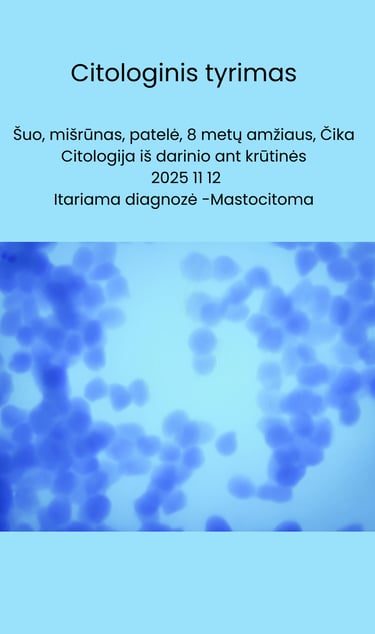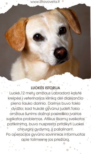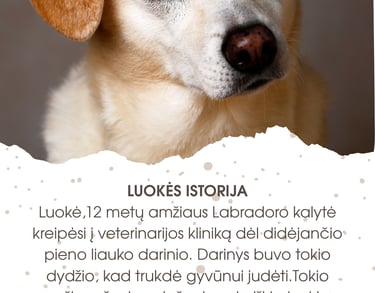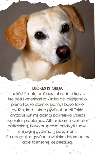 Luokė, 12 metų amžiaus Labradoro kalytė, kreipėsi į veterinarijos kliniką dėl didėjančio pieno liaukų darinio. Darinys buvo tokio dydžio, kad trukdė gyvūnui judėti.Tokio amžiaus šunims dažnai pasireiškia įvairios sveikatos problemos. Atlikus išsamų sveikatos patikrinimą, buvo nuspresta pritaikyti Luokei chirurginį gydymą, jį pašalinant. Darinio dydis -1,2 kg. Po operacijos gyvūno savininkas informuotas apie tolimesnę augintinio priežiūrą.