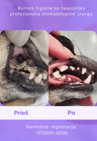 Šunų ir kačių burnos higiena atliekama bendrinėje nejautroje, todėl augintiniui visiškai nesukelianti diskomforto. Dantų apnašos ir akmenys nuvalomi su naujoviška profesionalia stomatologine įranga.